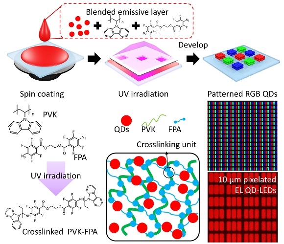 이 기술은 양자점을 정공수송층 고분자(PVK)와 광가교제(FPA)와 섞은 뒤 자외선을 쏘이면, 고분자끼리 서로 단단히 연결돼 3차원 그물망 구조를 만들고, 그 사이에 양자점이 안정적으로 고정되는 원리다. 이 과정을 통해 원하는 위치에만 양자점을 정확하게 남길 수 있어 매우 높은 해상도의 미세 패턴 구현이 가능하다.