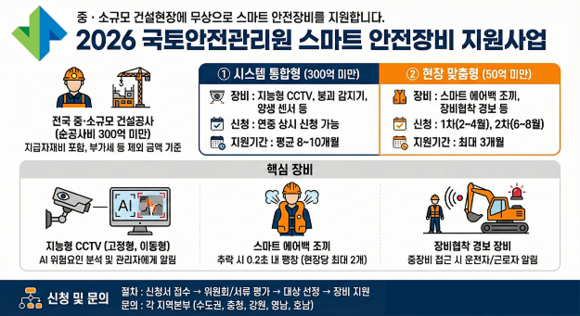 국토안전관리원은 중·소규모 건설현장의 안전확보를 위해 2026년 스마트 안전장비 지원사업을 본격 추진한다고 4일 밝혔다.
