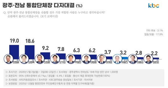 한편 여론조사는 △조사기간 : 2026년 2월 2일~3일(2일간) △조사대상 : 광주광역시.전라남도 18세이상 성인남녀 1.000명 △표본오차 : 95% 신뢰수준 ±3.1p △응답률 : 6.4% △표집률 : 통신사 제공 휴대전화 가상번호 (100%) △조사방법 : ARS자동응답조사 △조사주관 : KBC광주방송·광남일보 △조사주관 : 리서치뷰 △보정방법 : 2025년 12월말 행정안전부 주민등록인구통계 성·연령·지역별 인구비례(셀가중) 자세한 사항은 중앙선거여론조사심의위원회 홈페이지에서 확인할 수 있다.