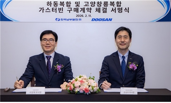 한국남부발전이 11일 두산에너빌리티 창원 본사에서 고양창릉 및 하동 복합발전소에 설치될 가스터빈 구매 계약을 체결했다고 밝혔다.