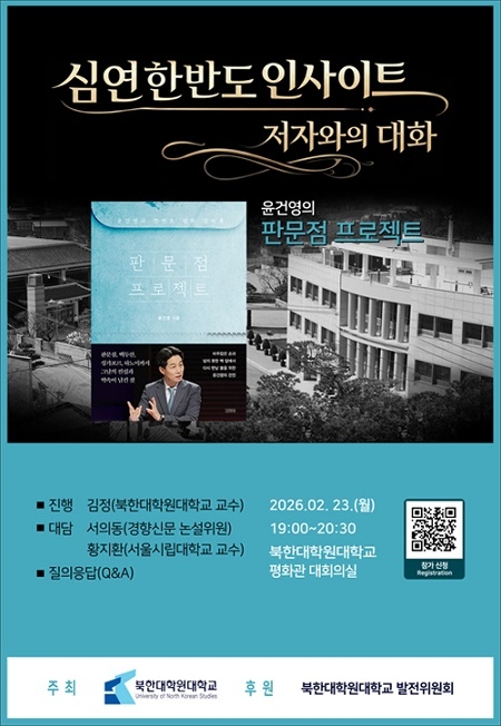 이번 행사는 윤건영 국회의원을 초청해 그의 저서 ‘판문점 프로젝트’를 중심으로 남북관계와 한반도 평화 프로세스의 실제 경험과 의미를 조명한다. 행사는 이날 오후 7시부터 8시 30분까지 북한대학원대 평화관 대회의실에서 열린다.
