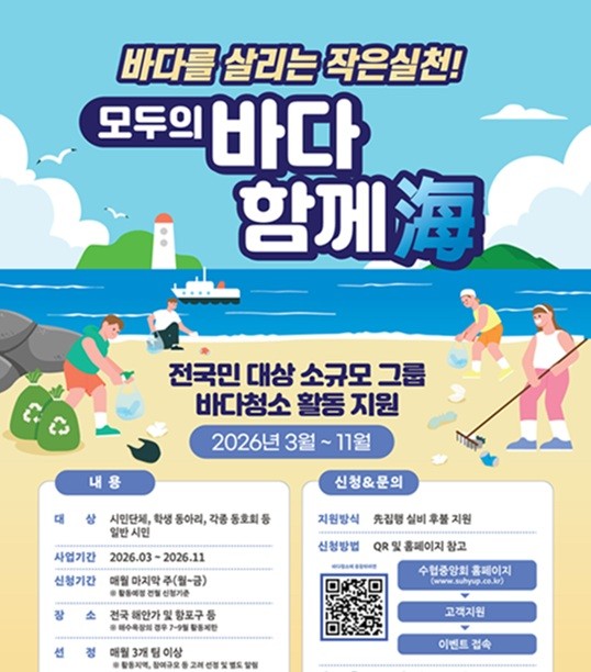 노동진 수협중앙회장은 “많은 국민이 더 쉽고 든든하게 바닷가 정화 활동에 참여할 수 있도록 신청 요건을 낮추고 지원을 확대했다”며 “우리 바다를 깨끗하게 지키는 실천에 국민들의 많은 관심과 참여를 부탁한다”고 말했다.