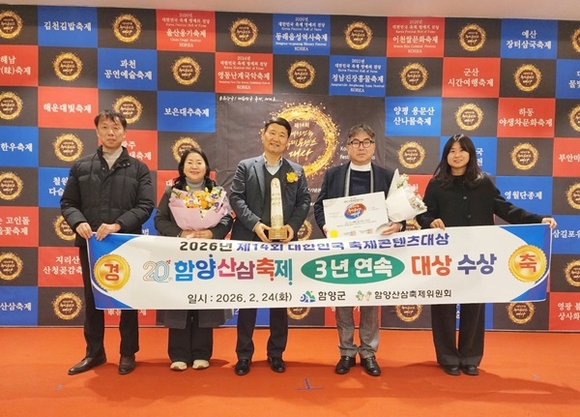 경남 함양군의 대표 축제인 함양산삼축제가 24일 서울 전쟁기념관 내 컨벤션홀에서 열린 '2026년 제14회 대한민국 축제콘텐츠대상' 시상식에서 축제경제 부문 3년 연속 대상을 수상했다.