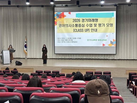 도교육청은 지난 24일, 화성 YBM 연수원, 25일 일산 동양인재개발원에서 도내 초·중·고 영어 교사 300여 명을 대상으로 ‘2026 경기미래형 영어의사소통 수업·평가 모형(CLASS UP) 안내 연수’를 개최했다. 연수는 2026 경기영어교육 정책 방향 안내, 인공지능 활용 수행평가 운영, 수업 설계・평가 문항 제작 실습 등으로 진행됐다.