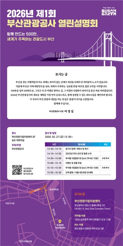 공사는 2025년 외국인 관광객 360만 명을 돌파하며 부산 관광의 성장세를 이어가고 있다. 이러한 성과를 일회성에 그치지 않고 안정적인 증가 흐름으로 이어가기 위해 올해는 업계와의 협력을 한층 강화하는 데 중점을 둘 계획이다. 예정된 공모 및 입찰 사업을 보다 구체적으로 안내하고, 사업별 추진 일정과 참여 방법 등을 사전에 공유해 지역 관광기업의 실질적인 참여 기회를 확대한다는 구상이다.