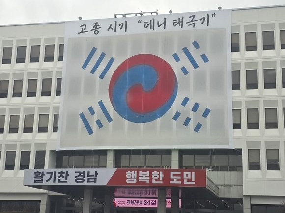 27일 경남도청 본관 외벽에 고종 시기 '데니 태극기'가 걸려 있다. 이 태극기는 제107주년 3·1절을 맞아 현존하는 태극기 가운데 가장 오래된 실물 중 하나이자 국가유산 보물(제2140호)로 지정된 '데니 태극기'를 대형 현수막 형태로 재현했다.