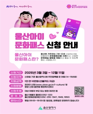 시 관계자는 “울산아이문화패스는 모든 아이들에게 균등한 문화 향유 기회를 제공하고, 양육 가구의 경제적 부담을 완화하는 동시에 지역 문화산업에도 활력을 불어넣는 사업”이라며 “아이들이 문화 속에서 성장하며 꿈을 키울 수 있도록 지원을 지속 확대하겠다”고 말했다.