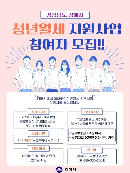 경남 김해시는 오는 11일부터 26일까지 월 최대 20만원, 12개월간 지원하는 '2026년 김해시 청년 월세 지원사업' 참여자 76명을 모집한다고 4일 밝혔다.