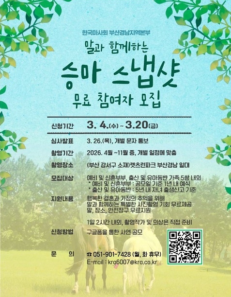 한국마사회 렛츠런파크 부산경남은 말과 특별한 순간을 기록할 수 있는 ‘말과 함께하는 무료 승마 스냅샷’ 참여자를 오는 20일까지 모집한다고 9일 밝혔다.