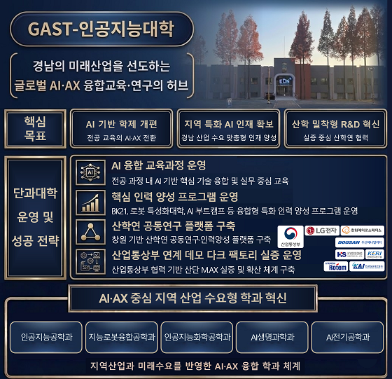 GAST-인공지능대학은 인공지능공학과, 인공지능화학공학과, AI생명과학과, AI전기공학과, 지능로봇융합공학과로 구성되며, 제조AI, 산업데이터, 바이오AI, 지능형로봇, 스마트전력, AI융합 응용 분야를 아우르는 교육·연구·실증 허브 역할을 수행할 것으로 기대된다.