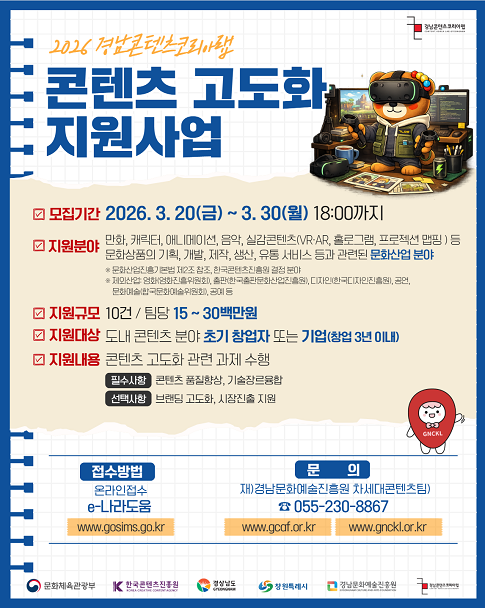 경남도와 경남문화예술진흥원은 도내 유망 초기 콘텐츠 기업의 실질적인 자생력을 높이고 시장 경쟁력을 강화하기 위해 ‘2026 경남콘텐츠코리아랩 콘텐츠 고도화 지원사업’의 참여 기업을 모집한다고 13일 밝혔다.
