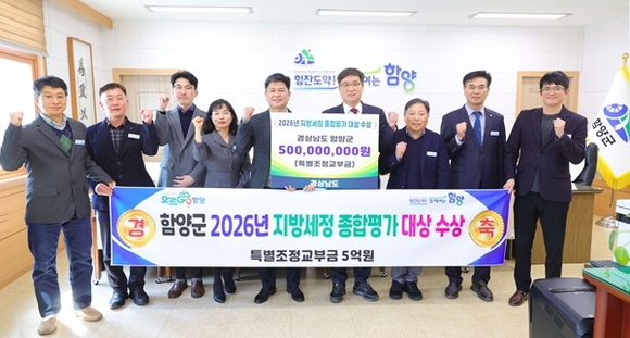 함양군은 경남도가 주관한 '2026(2025년 실적) 지방세정 종합평가'에서 최고 등급인 대상을 받아 상사업비 5억 원과 도지사 기관 표창을 받았다고 13일 밝혔다.
