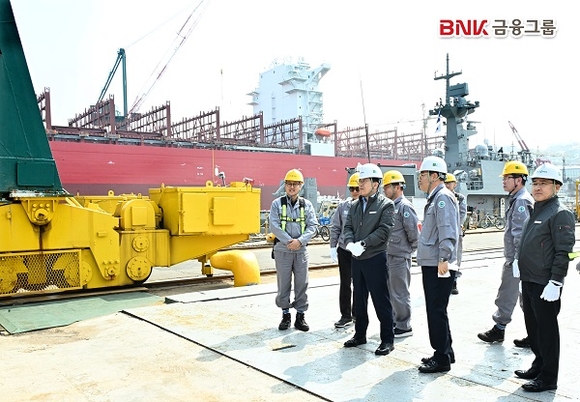 27일 빈대인 회장이 영도구에 위치한 HJ중공업을 방문해 조선·해양 산업 현장을 둘러보고 있다.(사진=BNK금융그룹 제공)
