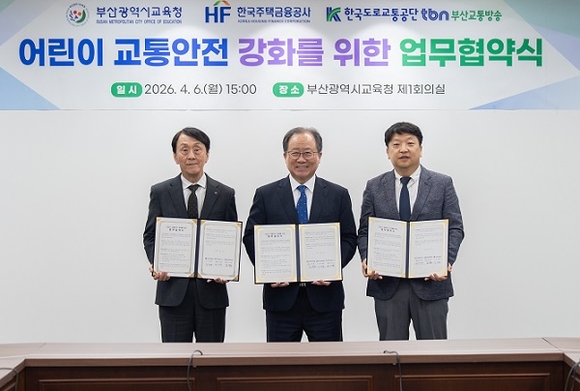 부산시교육청은 지난 6일 시교육청 회의실에서 어린이 교통사고 예방과 안전한 통학환경 조성을 위해 한국주택금융공사, 한국도로교통공단 tbn부산교통방송과 '어린이 교통안전 강화를 위한 업무 협약'을 체결했다.