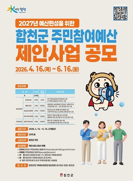 경남 합천군은 내년도 예산편성을 위한 주민참여예산 제안사업 공모를 오는 6월 16일까지 실시, 올해부터 공모 분야를 기존 1개 모델 3개 유형에서 3개 모델 5개 유형으로 확대 개편한다고 20일 밝혔다.